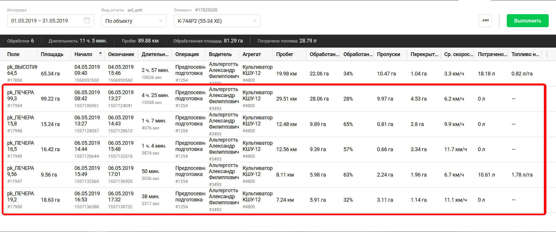 4. Топливо в обрбаотке рассчтывается по отрезкам в поле и в непосредственной близости к полю (развороты), так что если выполнять на виалоне отчет за тот же период, то цифра может и не совпадать (особенно, если объект на этом же интервале обрабатывал еще пару полей).