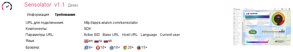 На конференции Телематика 2013 Осень был анонсирован новый Apps Sensolator, который предоставляет удобный интерфейс для мониторинга стационарных объектов. Главное отличие интерфейса заключается в том что для каждого объекта появилось дополнительное окно в котором можно настроить отображение текущей телематической информации в виде стрелочных датчиков (типа тахометр), градусников, тумблеров, лампочек и т.д.