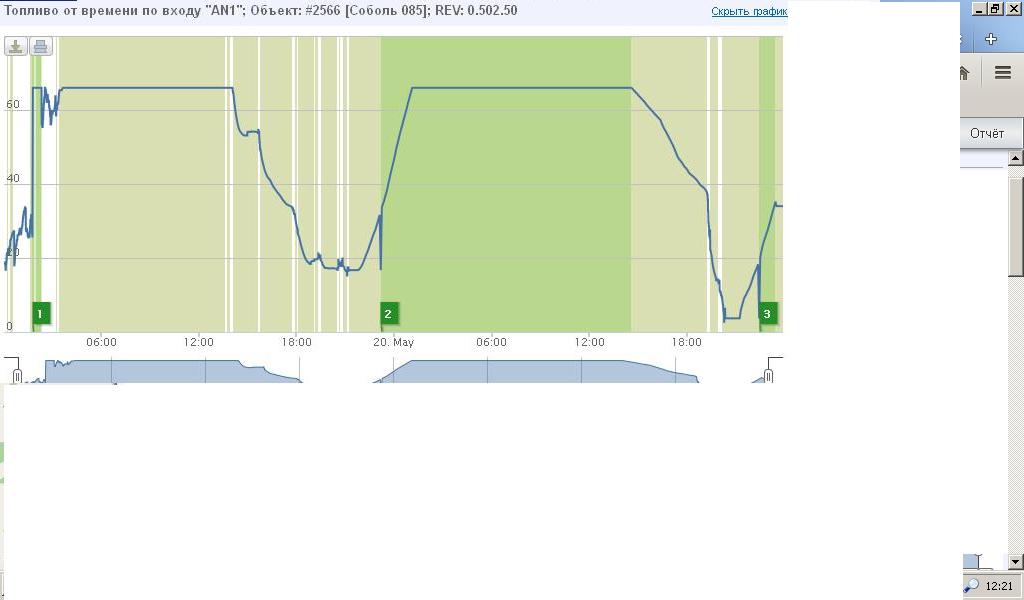 Писал ниже, что появилось сначала три машины с горизогтальной линией уровня топлива.Всё время на одном уровне.Съездил, перетарировал Верх\низ, вроде стал показывать изменения графика, но измененияя капец какие...картинку прикладваю.Сразу вопрос , что делать? Отправлять на замену?Датчики ЛАЙТЫ, баки установлены под днищем.Хлопотно немного ездить и сдёргивать баки...