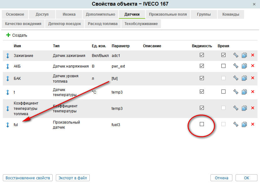 2. - первый "Датчик уровня топлива" изменить на "Произвольный датчик" (чтоб отчёту не мешал) и убрать галочку Видимость