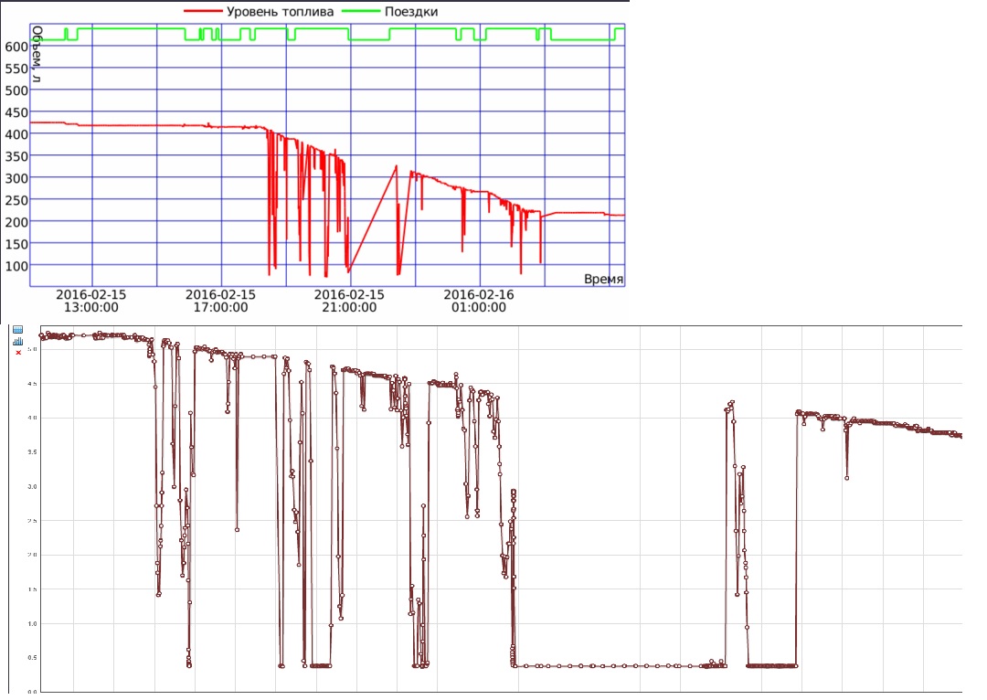 Попробуйте установить некоторое небольшое значение для параметра "Нижняя граница X" в таблице расчета для ДУТ, а также провалидировать ДУТ зажиганием (тип валидации - Проверка на неравенство нулю) - похоже, что падает уровень топлива именно во время отключения зажигания.