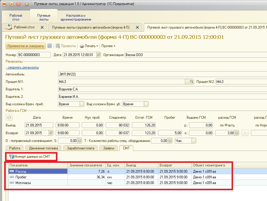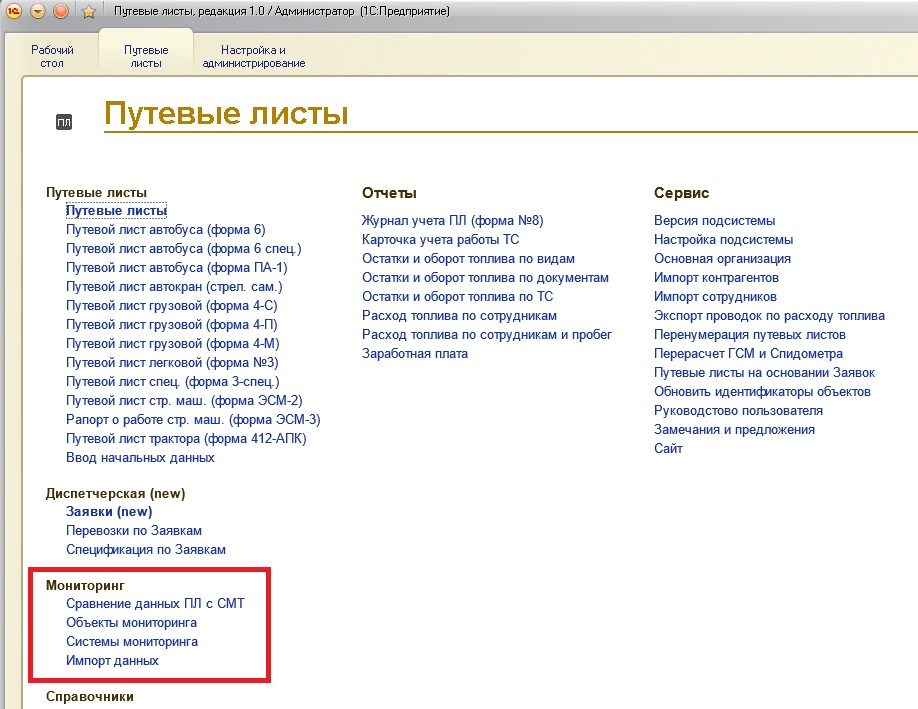 Так же для платформ 1С есть дописание функционала "Путевые листы", которые так же возможно автоматически заполнять с сервера мониторинга Wialon, который можно "накатить" на любую программу базе 1С:Предприятие 8