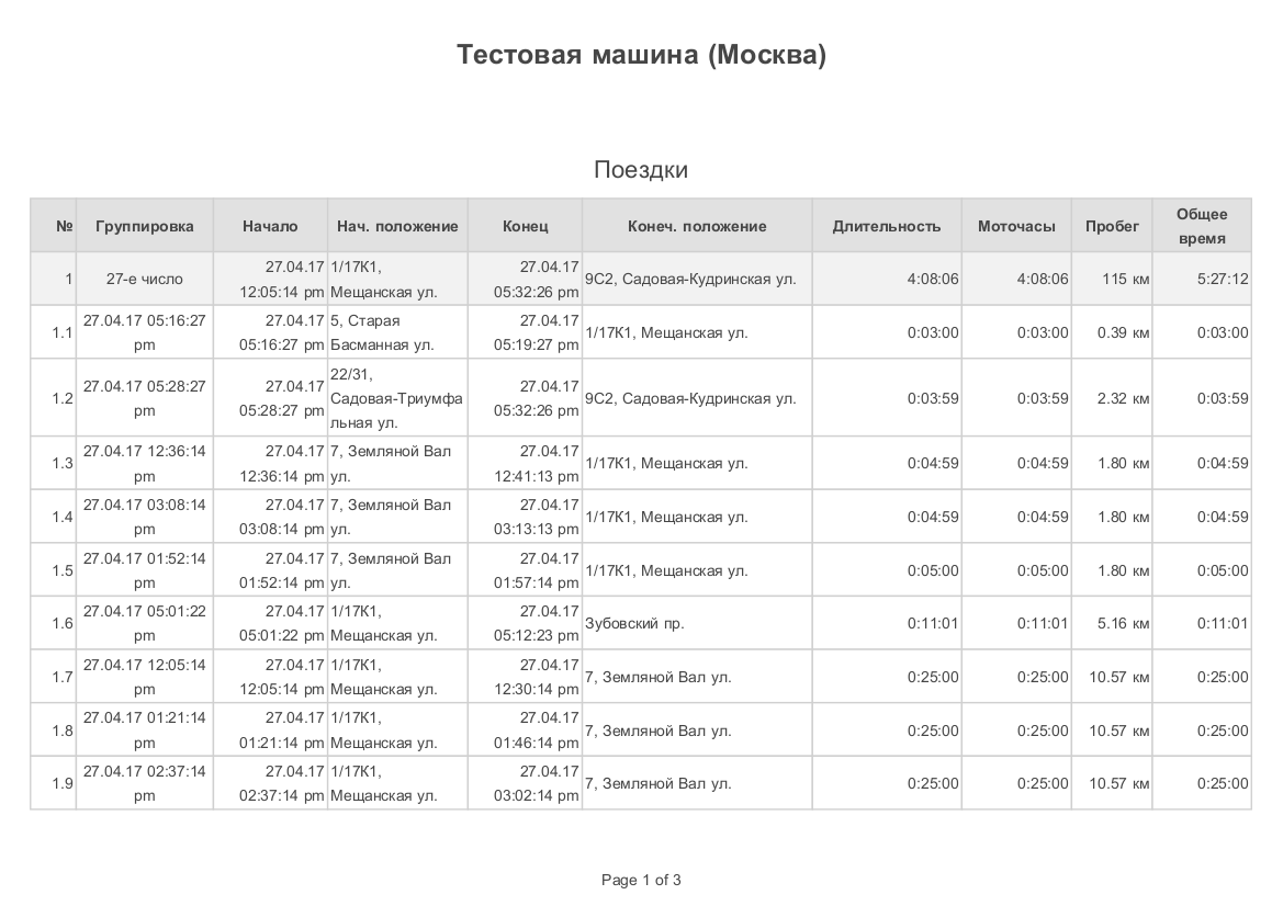Я построил отчет Поездки за месяц,  сгруппированы в отчете по дням, а в pdf они выводятся подробно,