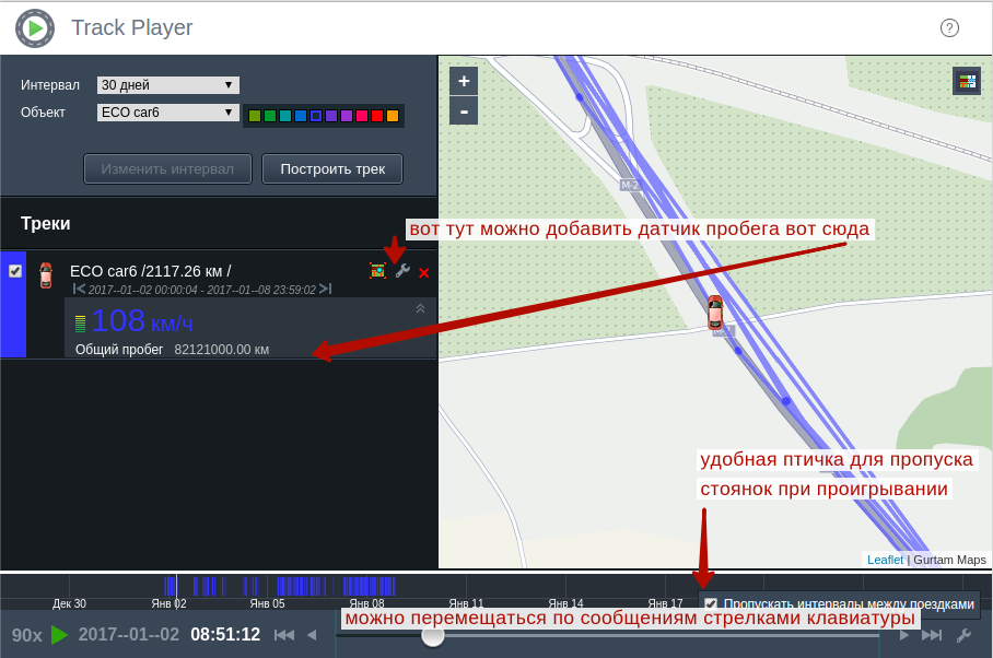 2) необходимо что-бы писался какой-то километраж при проигрывании трека, например начало 0км и пошло-поехало), т.е. клиент построил трек за день, прокрутил его, нашел заинтересовавшую его точку на карте и начал прокручивать трек далее, видя изменение километража пробега, так удобно смотреть небольшие расстояния и вычислять пробег от точки до точки не используя отчетов, создания геозон и т.д.