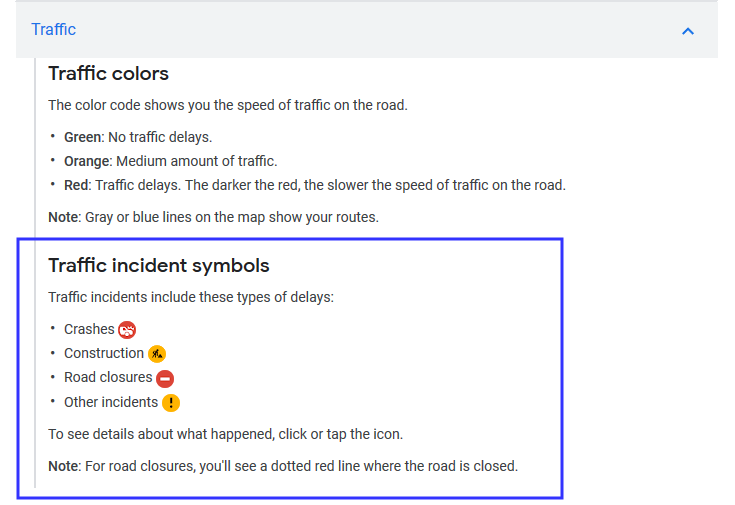 Our developer checked the traffic request and found no options for sending to define do we want to see any marks on roads. So we show what we can.