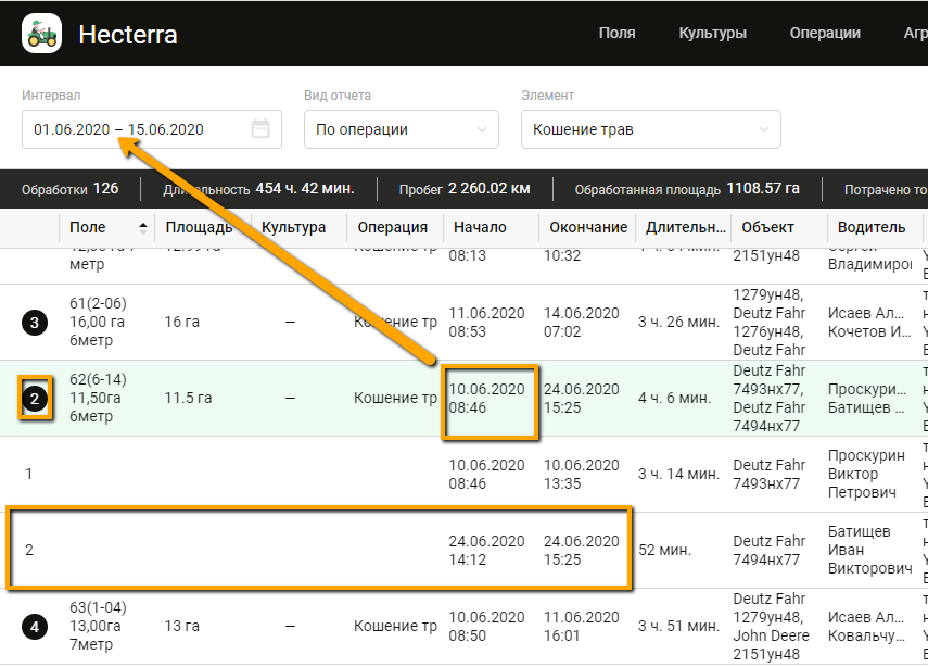 Возьмем отчет с 01.06.2020 по 15.06.2020 обработанная площадь составляет 1108,33 га