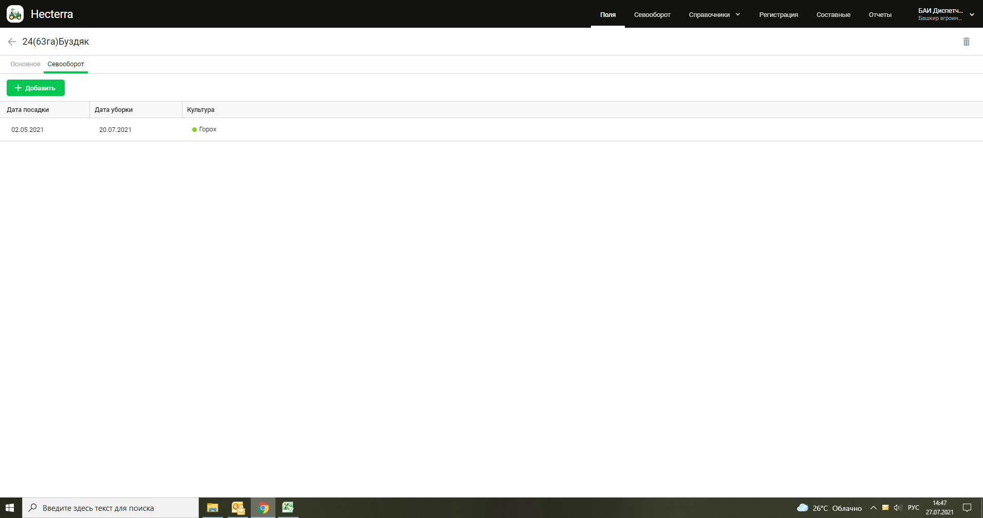 В севооборот попадает первая дата (то есть первая дата входа комбайнов на поле), после чего при регистрации обработок следующего дня на этом же поле, не показывает посеянную культуру и не вносится в севооборот как "уборка".