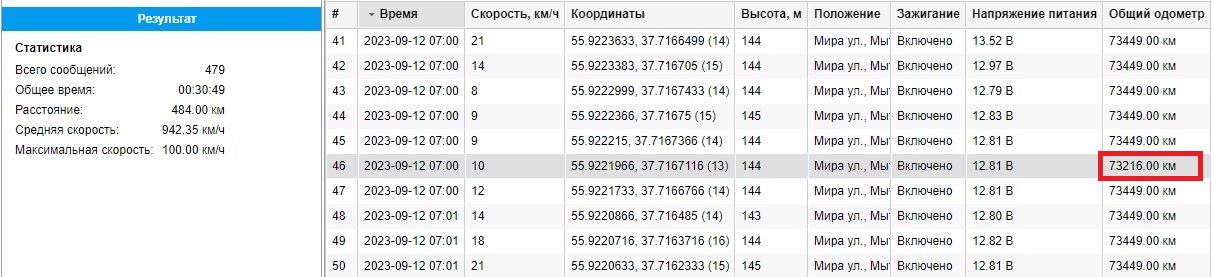 В вашем случае прибор иногда присылает два сообщения с одинаковой меткой времени, в этом случае они обрабатываются системой абсолютно в рандомном порядке. И может так получится, что значение пробега в последнем сообщении меньше, чем в предыдущем. Пример на скриншоте. В результате отсчет пробега начинается с нуля, то есть прибавляется целиком полученное значение, а не разница между двумя сообщениями.