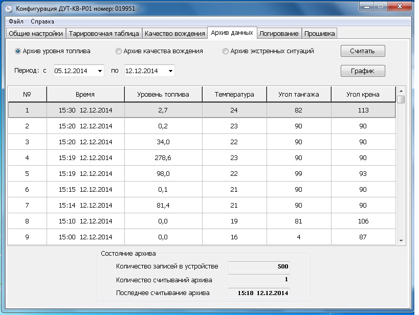 Датчик имеет встроенные часы реального времени и внутреннюю память. Все измеренные данные датчик хранит в собственной памяти за последние 60 суток. Способность датчика работать без терминала существенно снижает начальные затраты на установку систем контроля топлива и качества вождения автотехники.